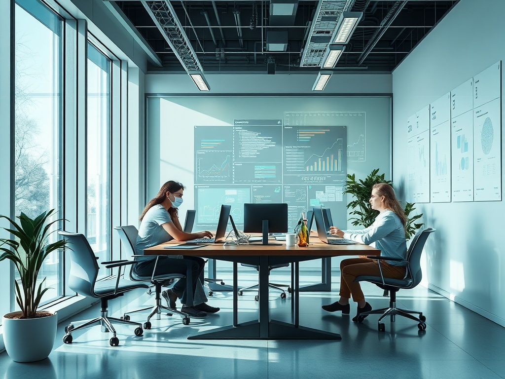 Молодая женщина в свитере работает за компьютером в уютном офисе, окружённая светом и зелеными растениями.