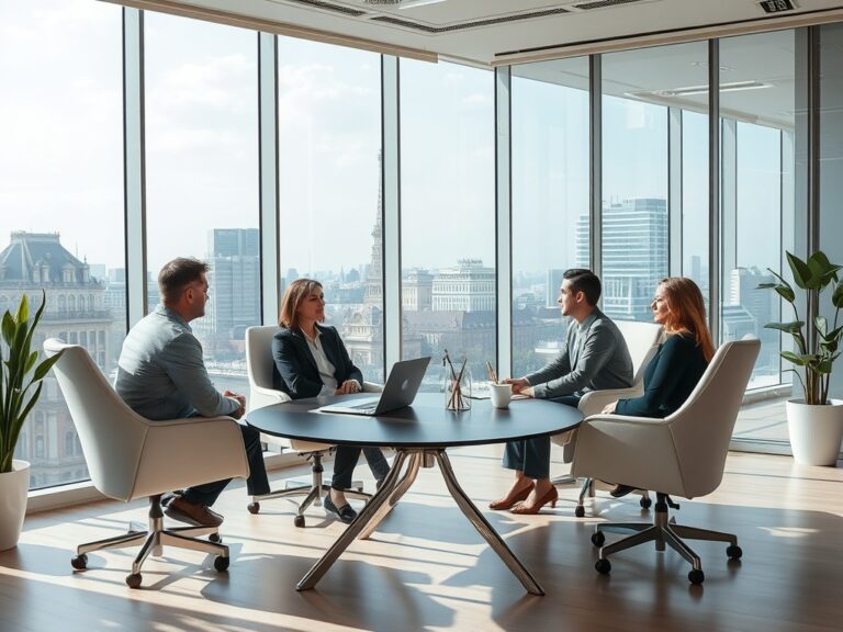 Совещание в офисе с видом на город. Шесть людей обсуждают идеи на фоне больших окон и современного интерьера.